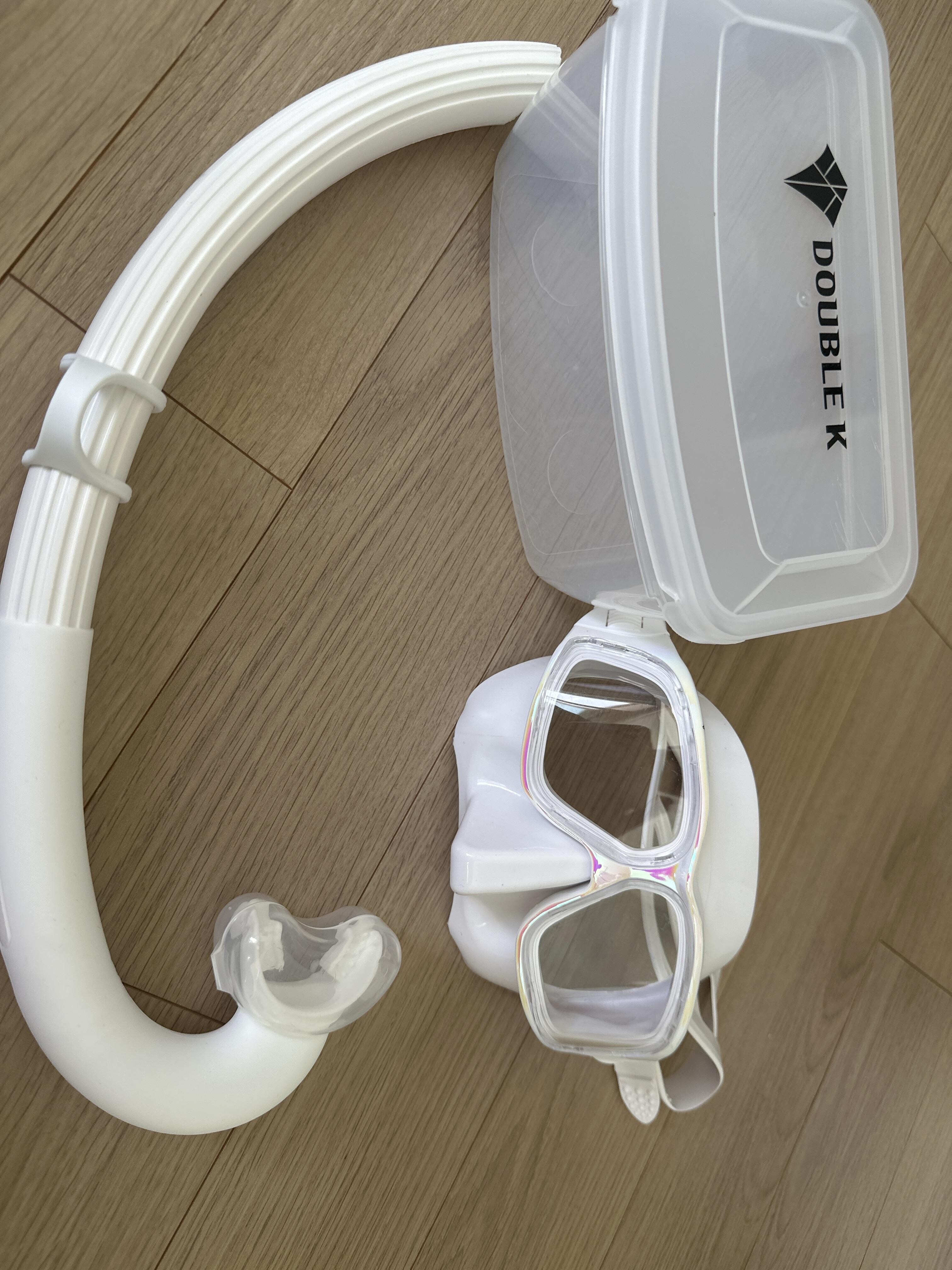 더블케이 화이트 스노쿨과 마스크로 화이트 조합을 마추었습니다. 사진 속 스노쿨 입에 있는 뚜껑은 다른 스노쿨 장비꺼를 가져왔습니다.