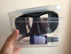 주문한 것과는 다르게 상단 뚜껑 모델이 왔습니다. 뚜껑 일체형이 편해 보이긴 했지만 뭔가 싸구려 같아 보이는 느낌이 있었는데 뚜껑형으로 와서 더 좋네요. 다만 뚜껑을 열 때 모서리 부분을 위로 올려서 열어야 하는데 주의해야 합니다. 벌어진 뚜껑 부분이 날카로워서 처음 여닫을 때 검지 손가락을 살짝 다쳤네요. 다이빙 후 손이 불어 있을 때는 특히 조심해야 할 것 같습니다. 야무지게 닫히는 덕분에 잘 닫아 놓으면 왠만해선 뚜껑이 열려 수경이 피해볼 일은 없을 것 같습니다. 사용하는 투사 수경에 네오프렌 스트랩 끼우고 여유 있게 들어 가...