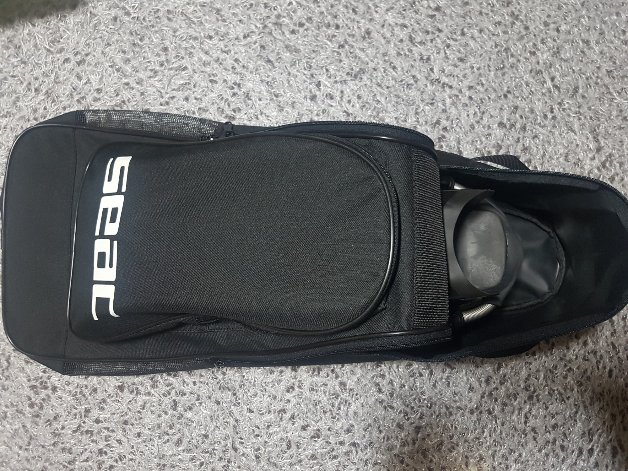 현재 백안에 5mm부츠, 후드베스트, 슈트하의, 스포츠 타올, 수영복, 래쉬가드 들어가 있는 모습인데 아직도 공간이 반정도 남네요.